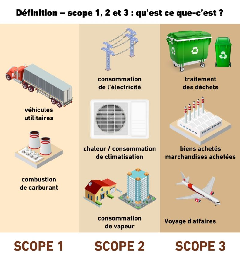 - Scope 3 : autres émissions indirectes (achats, transports, déchets, usage des produits…).